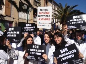 Après un parcours de 2,5 km dans les rues de la commune de La Garde près de Toulon, les étudiants, présents en large majorité ont convergé vers les grilles de l’Hôpital de La Garde qui avait pour l’occasion temporairement fermé ses portes. Dans une ambiance conviviale, l’ensemble des participants a souhaité exprimer son mécontentement au sujet de ce « supermarché à diplôme portugais », en interpellant à plusieurs reprises la ministre de la santé, Madame Marisol Touraine, notre ministre de tutelle. Devant les grilles, les étudiants ont symboliquement dressé un drapeau tricolore et entonné la Marseillaise.