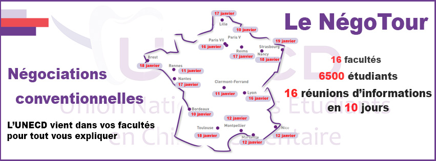 Soucieuse de son rôle d’information, de défense et de représentation des étudiants en chirurgie-dentaire de l’hexagone, l’UNECD a entrepris son NégoTour !